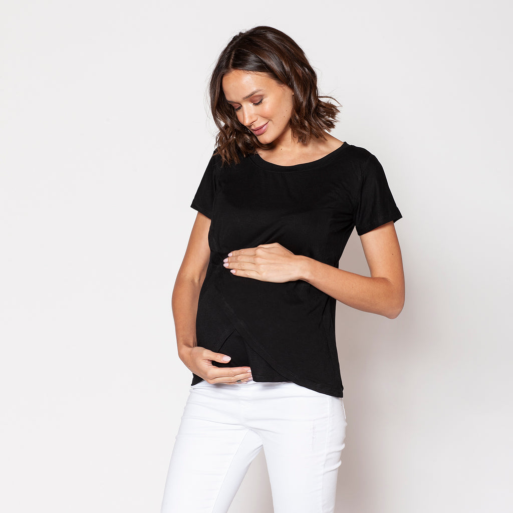Polera lactancia manga corte, con doble capa cruzada en la parte del frente, que esconde apertura para dar papa cómodamente de color negro. Un básico infaltable en tu closet.