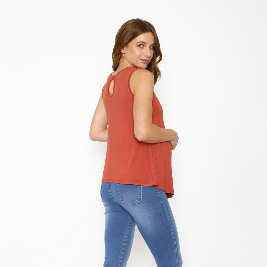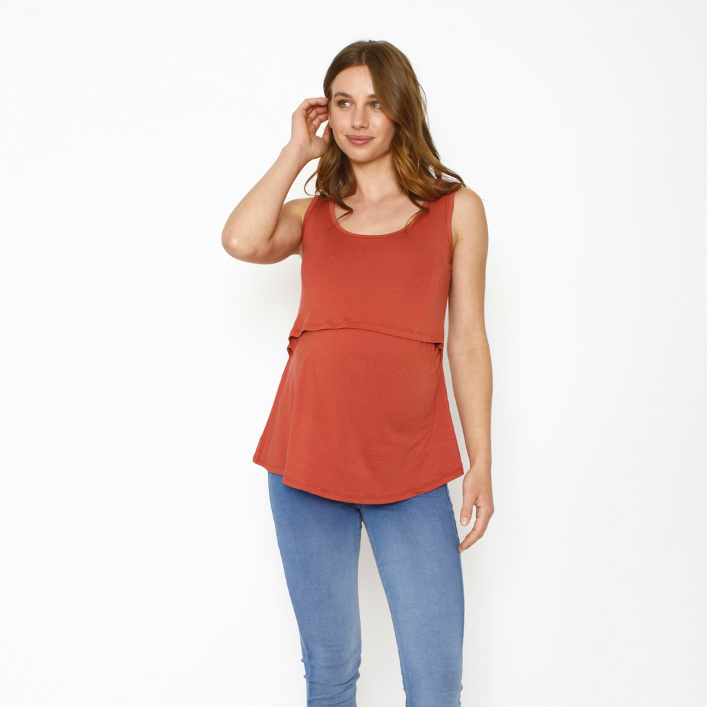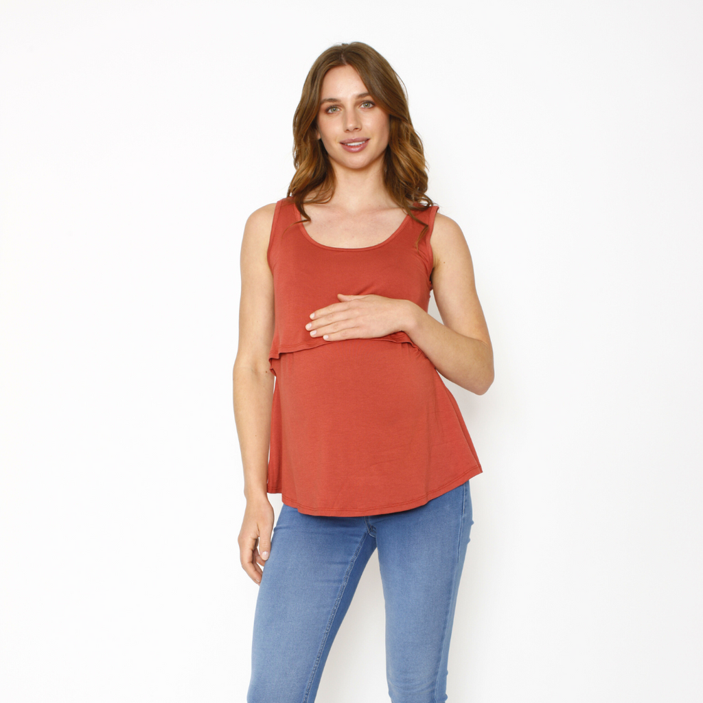 Polera lactancia sin mangas, con una capa más corta superpuesta en la parte del frente, que esconde apertura para dar papa cómodamente de color ladrillo. Un básico que no puede faltar en tu closet de embarazo.