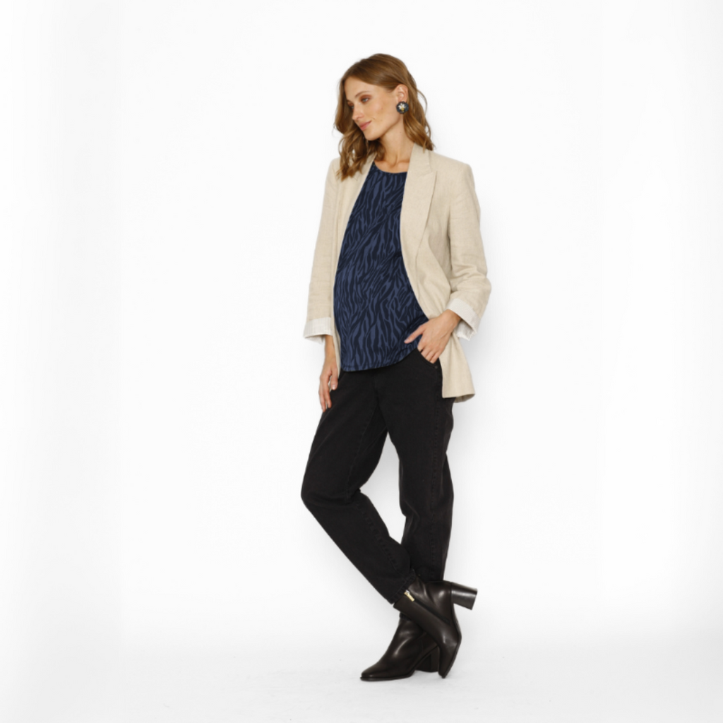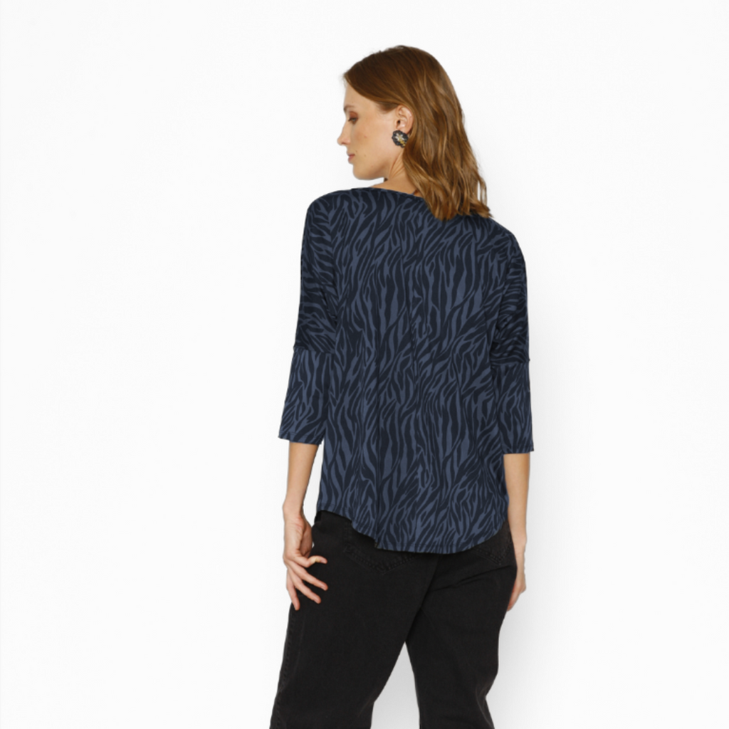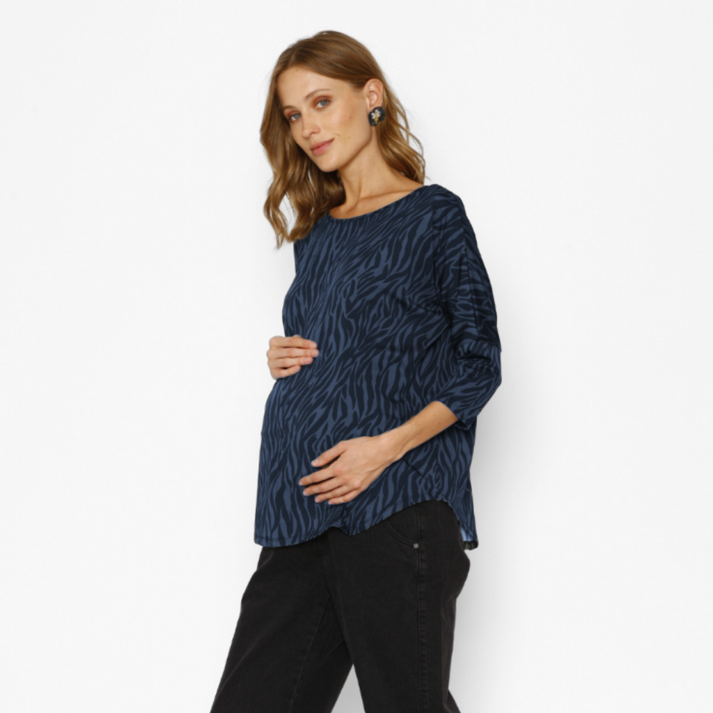 Polera maternal manga codo con un tiro más largo estampado de cebra en color azul.