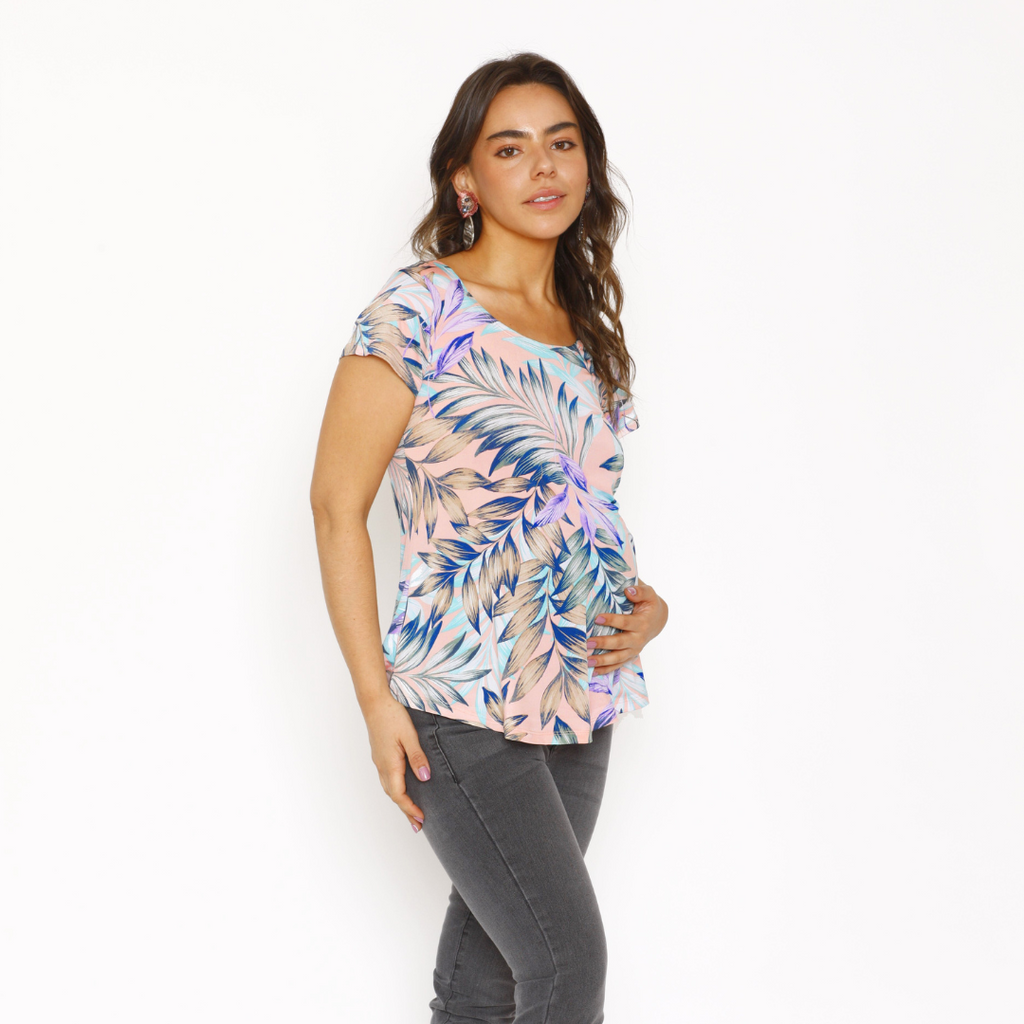 Polera Maternal Ruedo Curvo Hojas fondo rosa