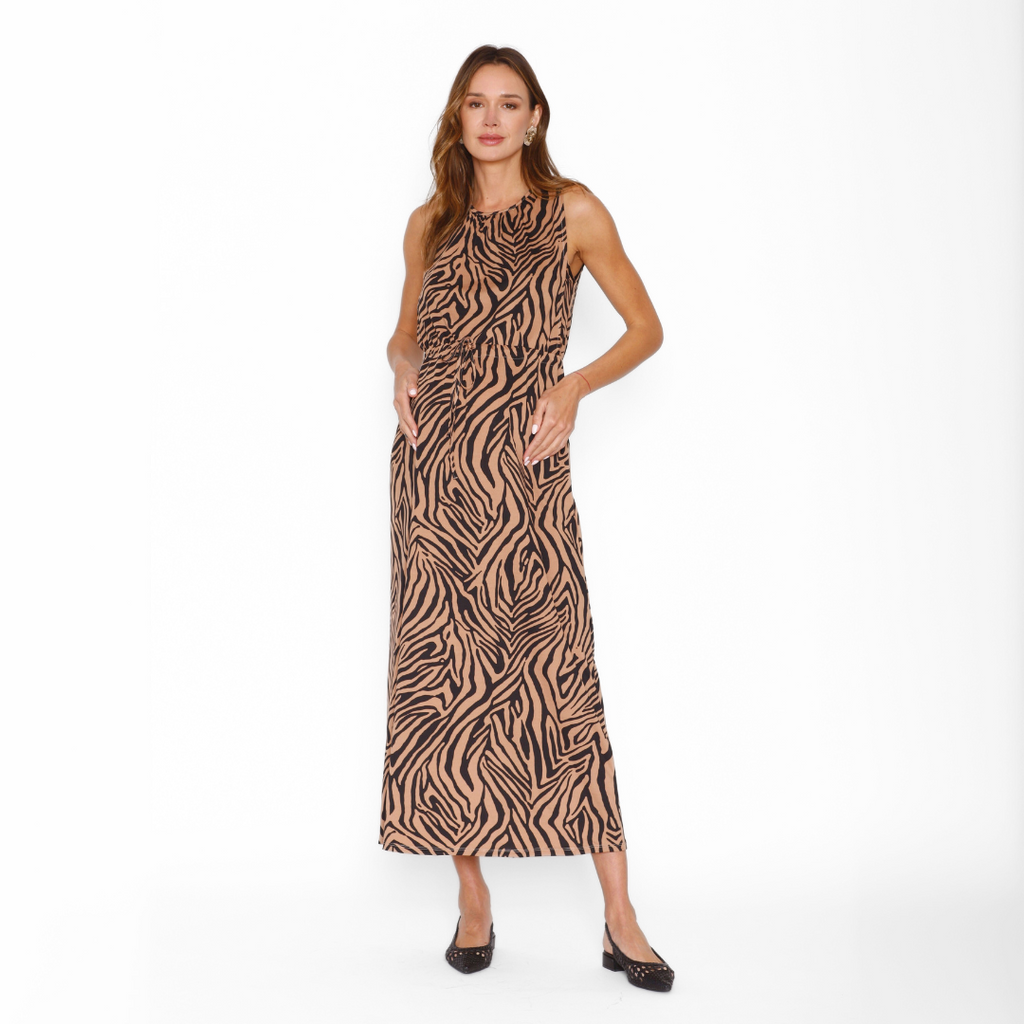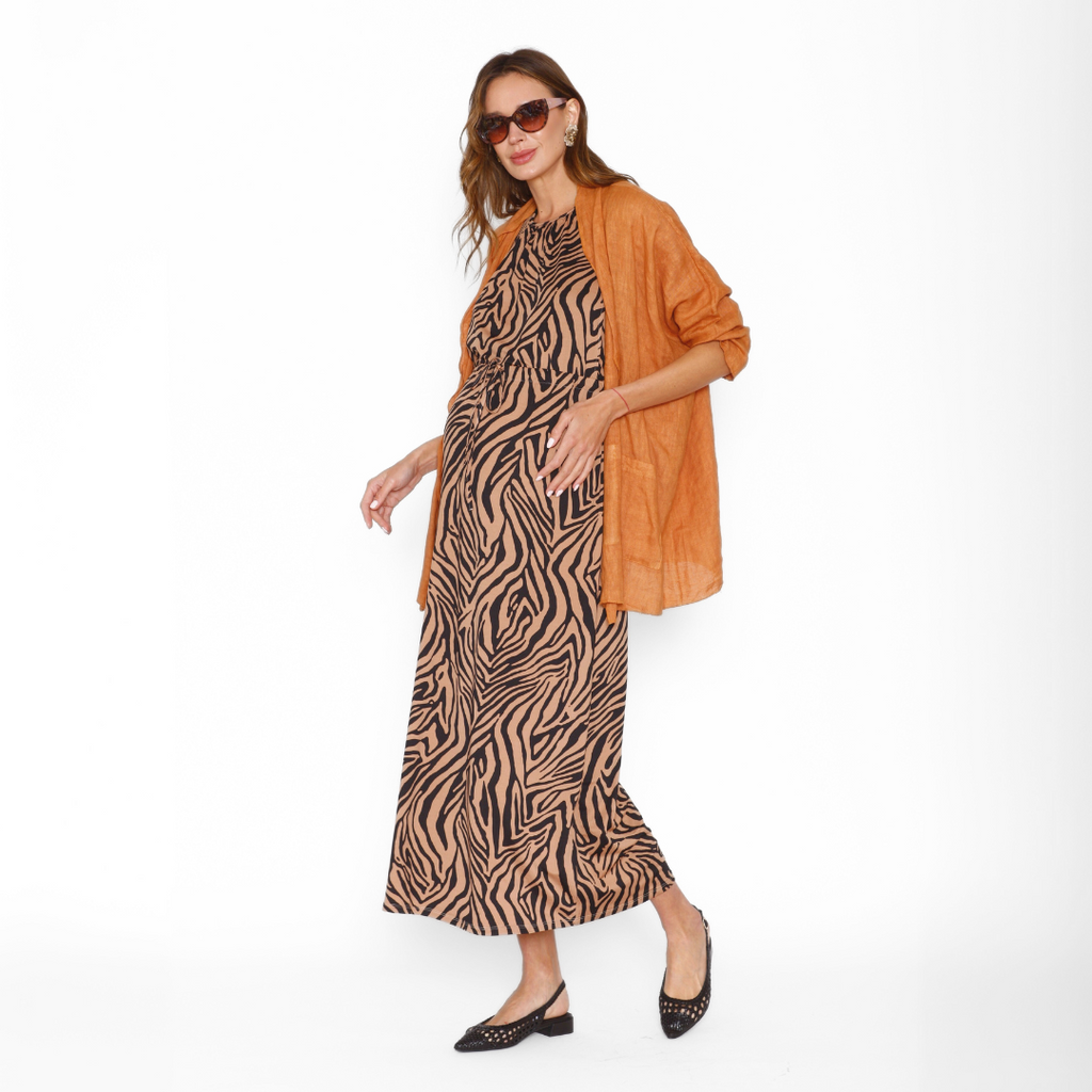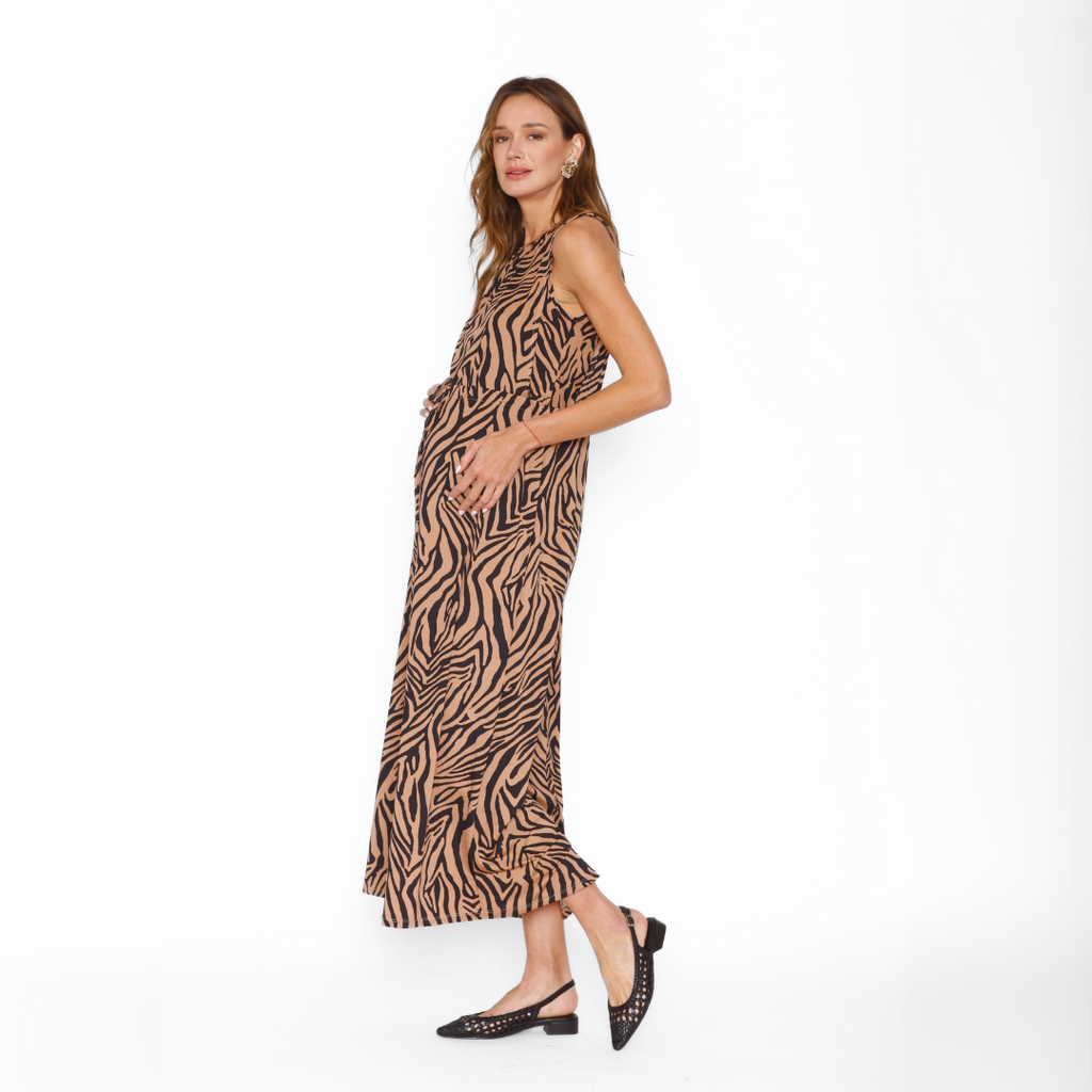 Vestido maternal y de lactancia modelo Gabriela Largo en estampado cebra con tonalidades arena.