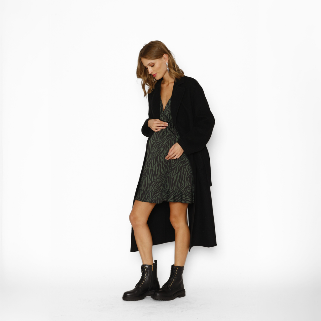 Las mangas globo con puño elástico le dan un toque moderno y femenino, y su corte favorecedor se adapta a tu cuerpo en esta etapa sin apretar ni incomodar. El estampado tipo cebra en tonos verdes le da un look diferente y con personalidad, ideal para usar tanto en el día a día como en ocasiones más especiales.