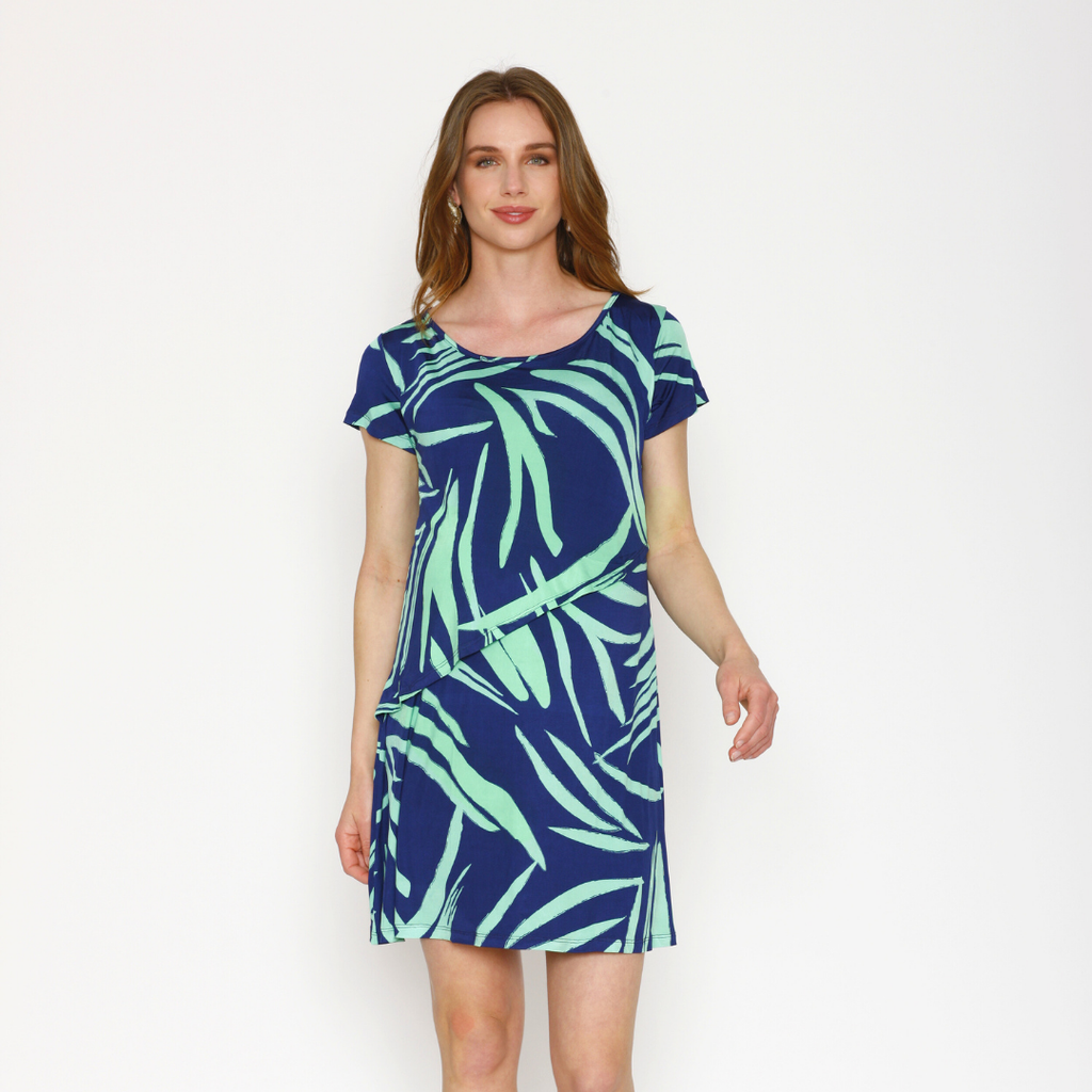 Vestido maternal y de lactancia de manga corta modelo Paz en color azul marino con figuras de bamboo en verde.