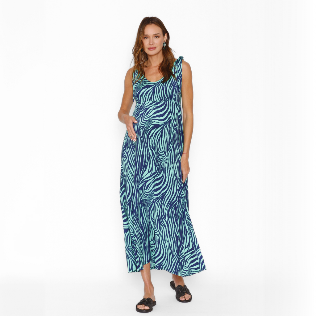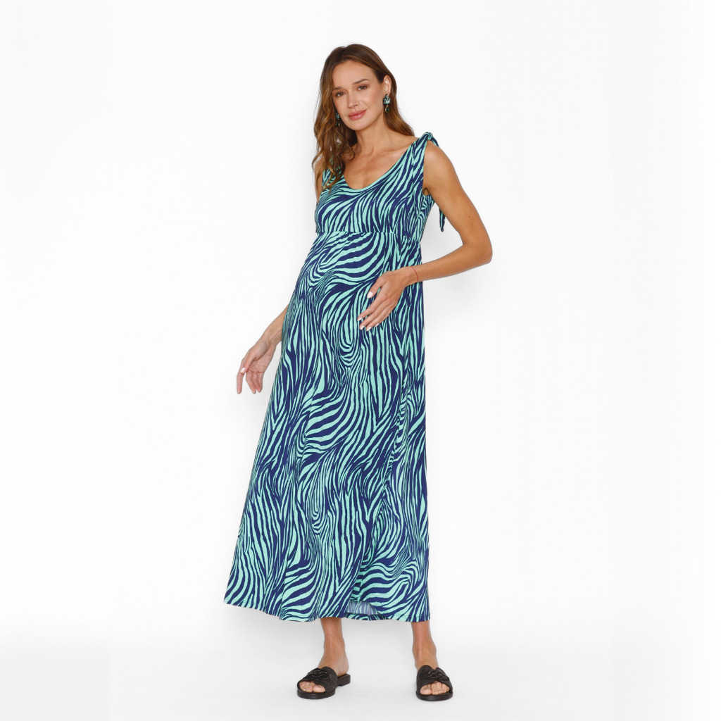 Vestido maternal y de lactancia modelo Pía Largo en estampado cebra turquesas.