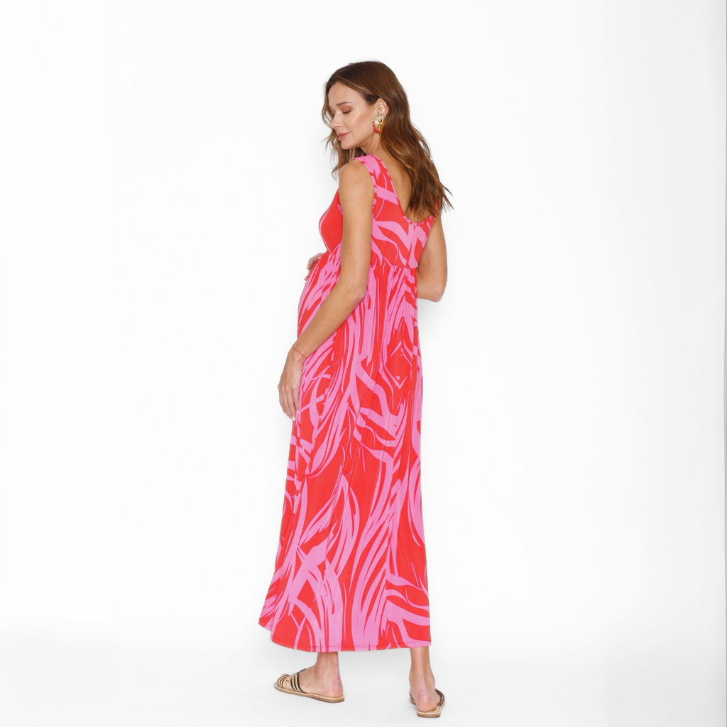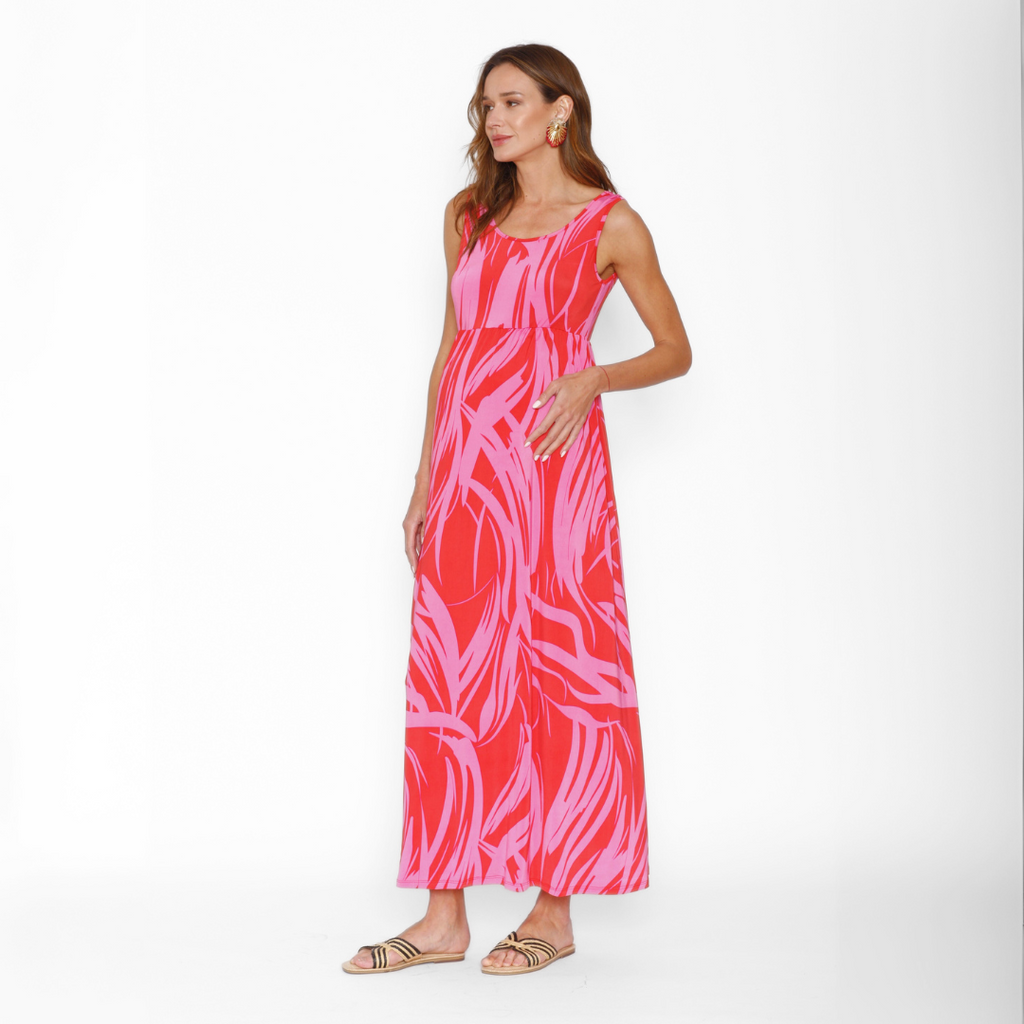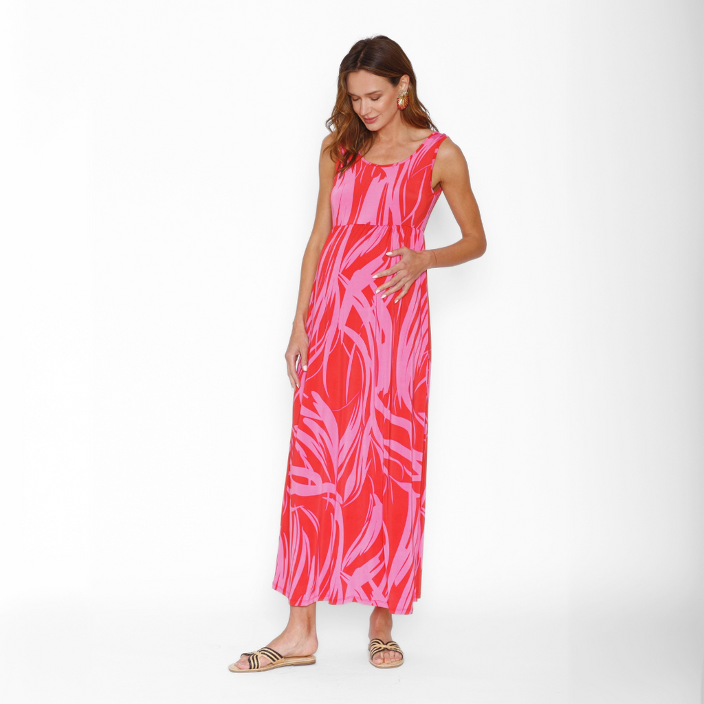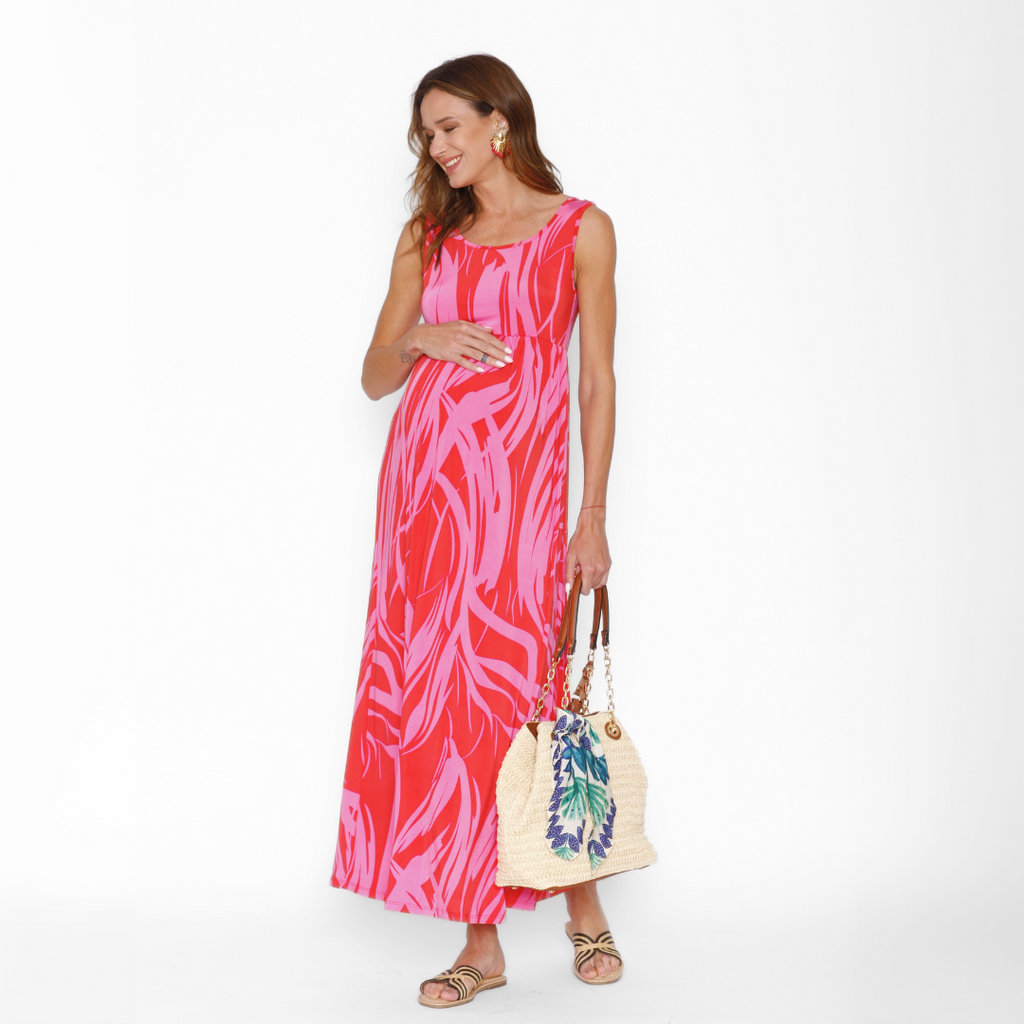 Vestido maternal sin mangas en estampado de ondas en rojo con fucsia. Un básico que no puede faltar en tu closet esta temporada.